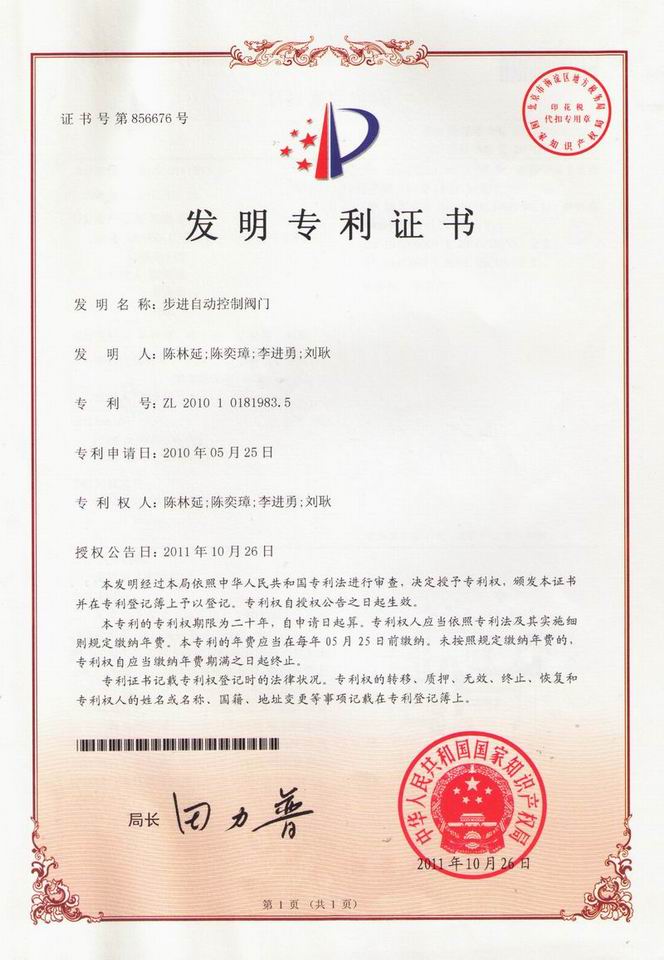 經(jīng)過公司研究人員兩年多的不懈努力,刻苦鉆研“步進自動控制閥門”研發(fā)成功,并于2010年5月25日向國家知識產(chǎn)權局申請專利保護。國家知識產(chǎn)權局經(jīng)過實質(zhì)性審查,于2011年10月26日授予專利權并頒發(fā)發(fā)明專利證書。