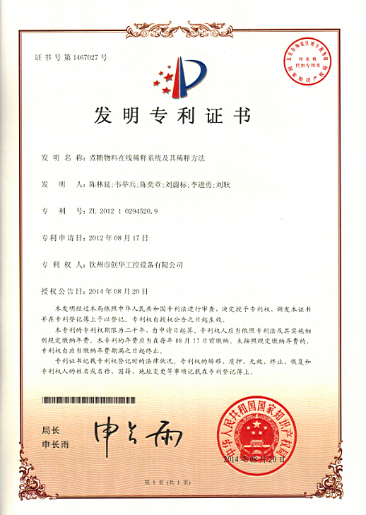 2014年8月20日,我公司自主研發(fā)的“煮糖物料在線稀釋系統(tǒng)”榮獲國家發(fā)明專利授權(quán)。截止目前,我公司已獲國家發(fā)明專利授權(quán)3項,實(shí)用專利授權(quán)5項。